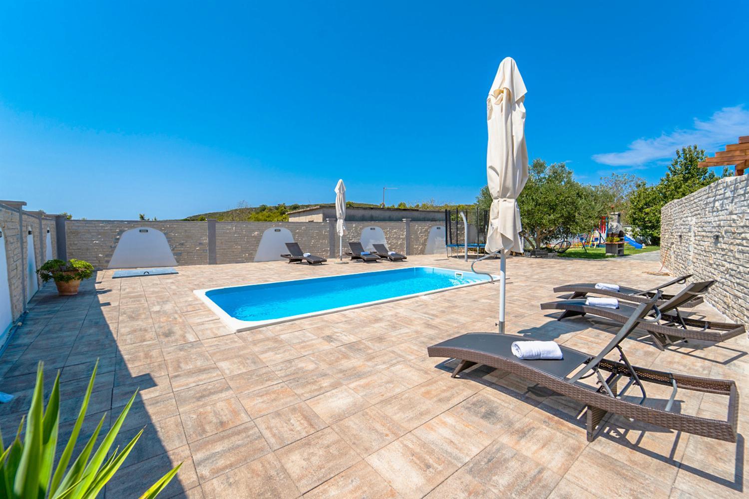 Outside, you’ll discover a private swimming pool measuring 7.0 meters by 3.0 meters, accessible via a ladder. The pool area includes additional features such as a pergola, sun-beds for lounging, and a poolside dining area, perfect for enjoying meals in the sunshine.