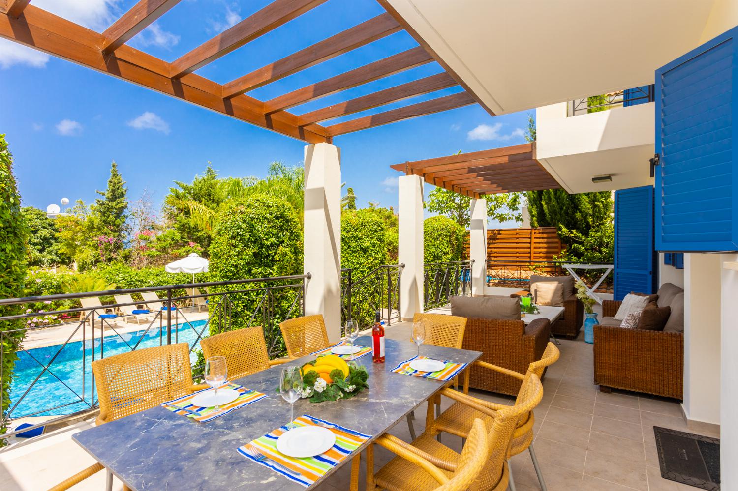 The living room is a spacious and inviting area that includes a dining section, comfortable sofas, a television, and complimentary Wi-Fi. From here, you can access the pool terrace, which offers stunning sea views through the patio doors.