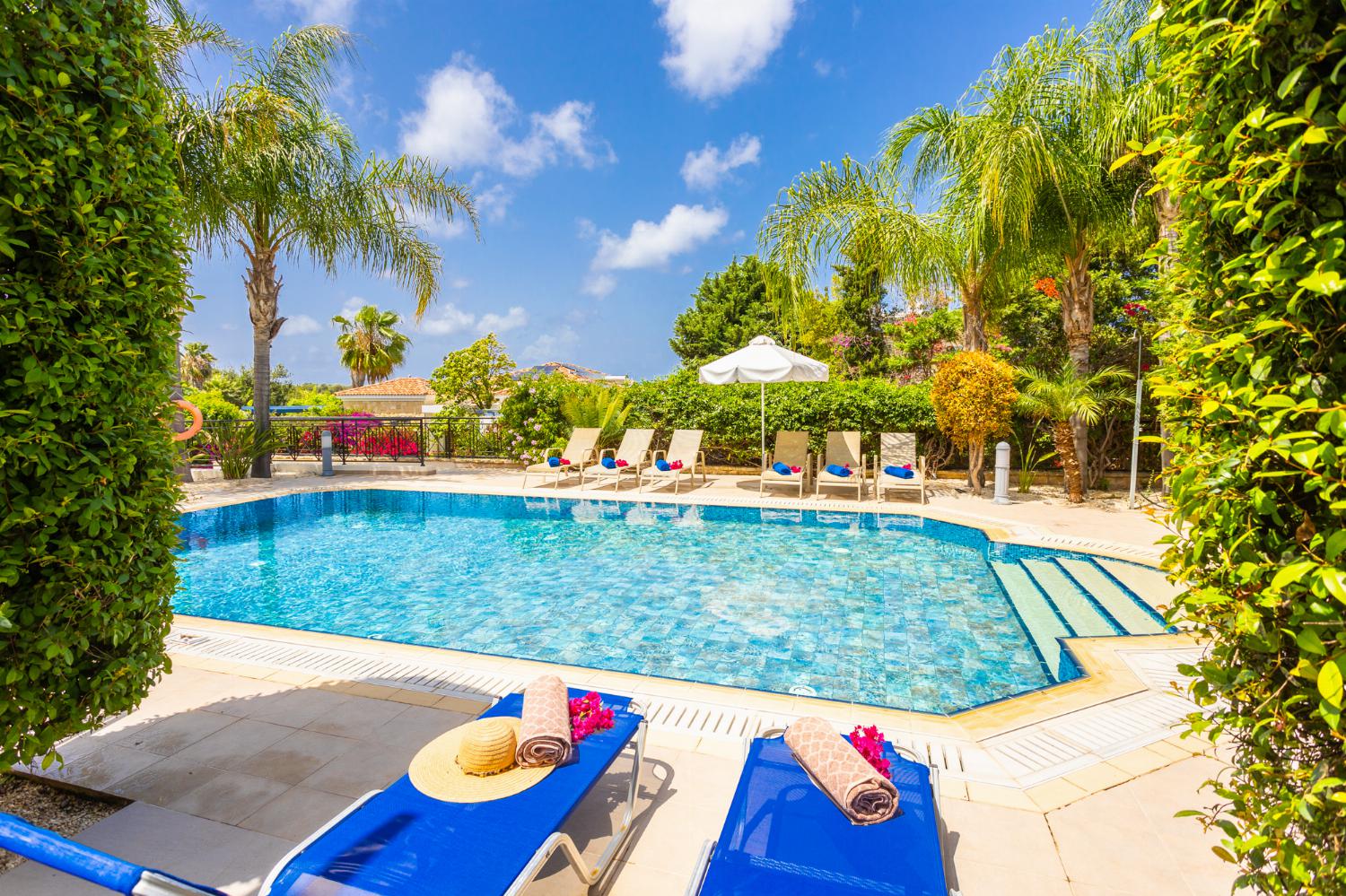 Outside, Villa Galene boasts a private swimming pool measuring 9.0 meters by 5.0 meters. The pool has a shallow end of 1.0 meter and a deep end of 1.80 meters, with access provided by steps. Guests can relax under the pergola or on the sunbeds, enjoying the serene surroundings at their leisure.