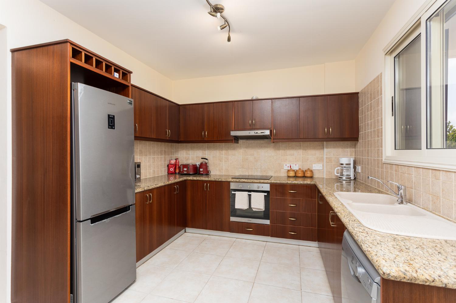 Adjacent to the living room is a well-appointed kitchen equipped with modern appliances such as a toaster, a coffee maker, and granite worktops. It also features essential amenities, including a washing machine, dishwasher, microwave, refrigerator, stove/hob, and oven. For those who enjoy outdoor cooking, there’s a barbecue available outside.