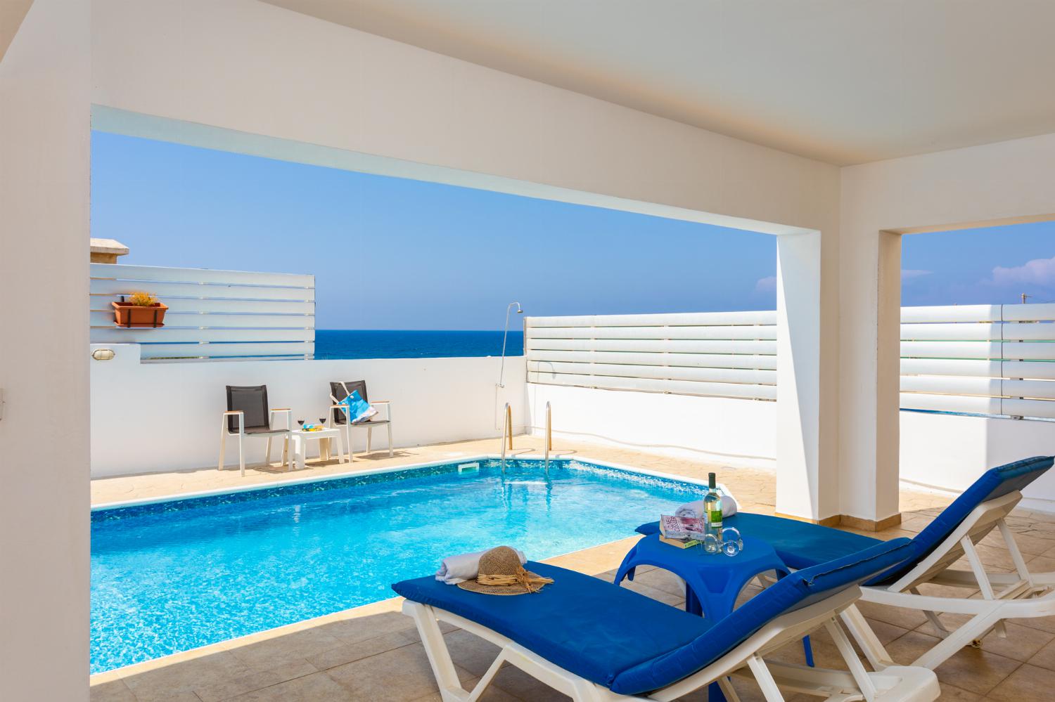 In terms of outdoor amenities, Villa Celena boasts a private pool measuring 9.0m by 4.5m, with depths ranging from 1.0m in the shallow end to 1.60m in the deep end. The pool is south-west facing, making it ideal for enjoying the sun. Access to the pool is via a ladder, and additional features include a pool shower, a pergola, sun beds, and a poolside dining area for al fresco meals.