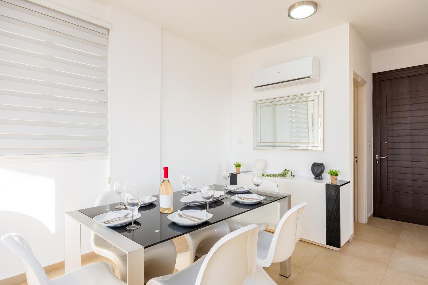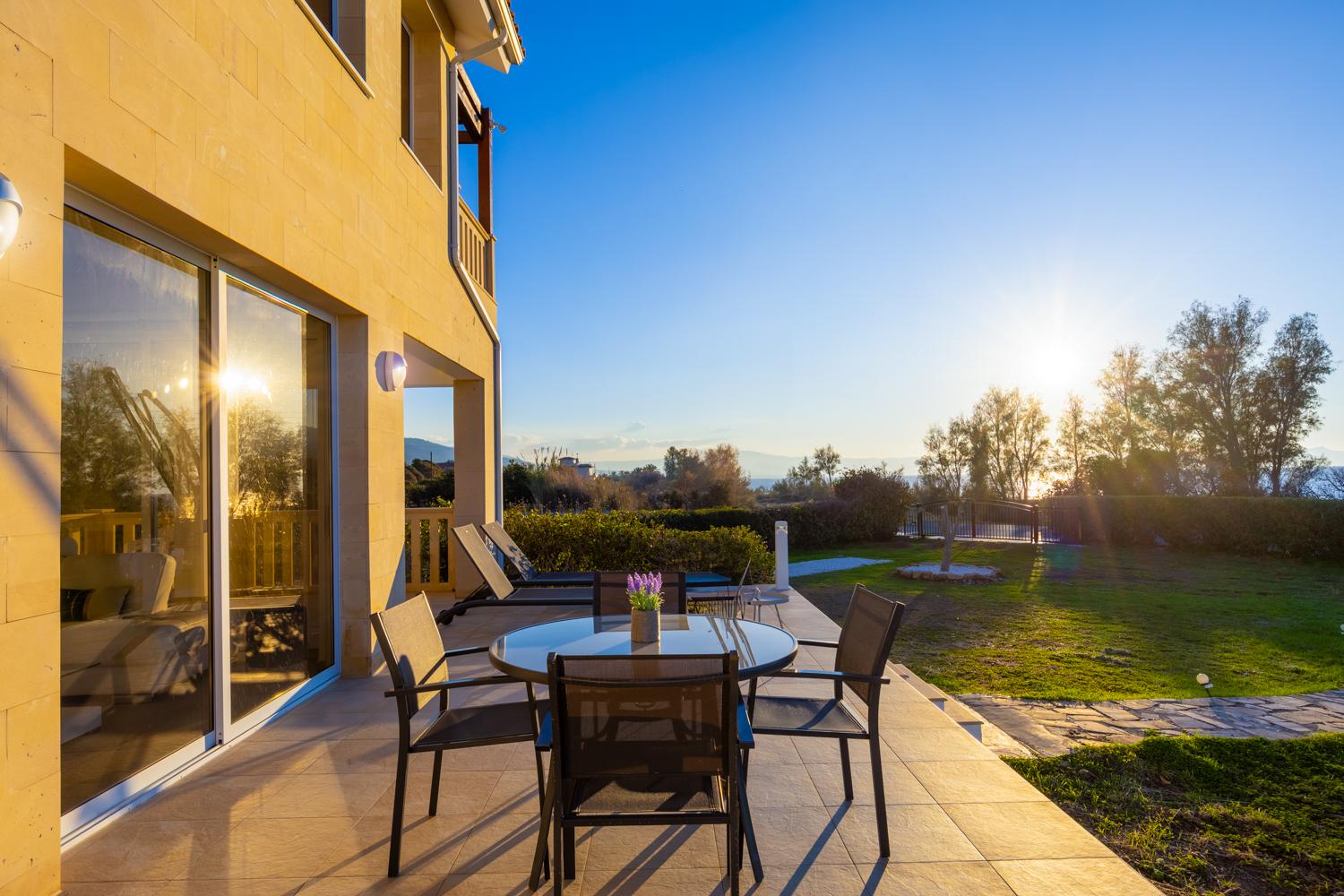 Outside, guests can step into a shaded dining area where they can unwind and enjoy the beautiful views. Whether soaking up the Mediterranean sun or relishing alfresco meals, the outdoor space offers the ideal setting for relaxation. The villa’s excellent location in Agia Marina, within the Paphos District, places the beach right at your doorstep, while local amenities are just a short stroll away, striking the perfect balance between tranquility and convenience.