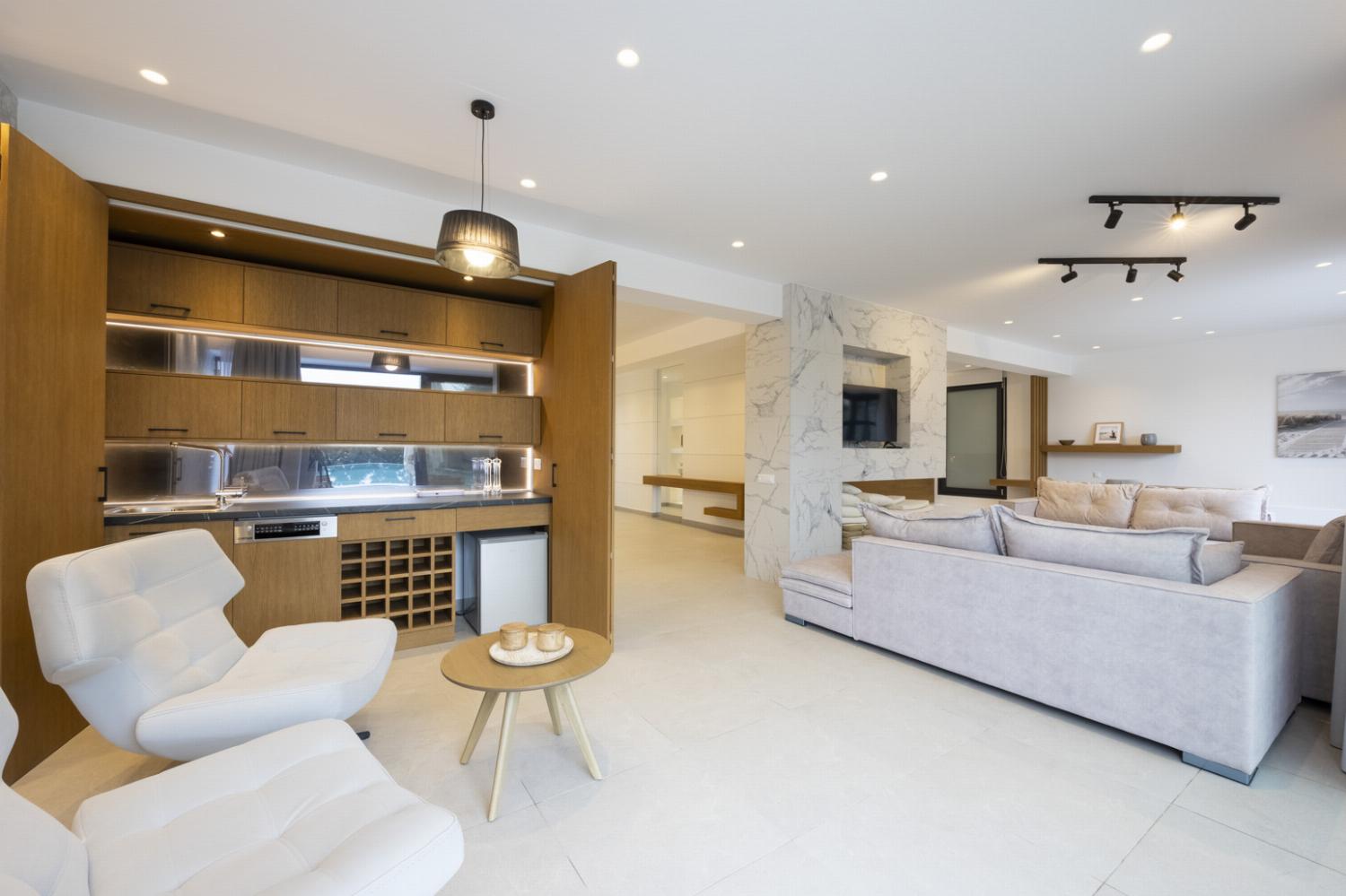 Adjacent to the living room, the stunning modern kitchen is a culinary paradise, delightfully air-conditioned for comfort. It boasts a stylish granite worktop that provides ample space for meal preparation. This fully equipped kitchen includes essential appliances such as a toaster, coffee maker, refrigerator, stove/hob, oven, microwave, washing machine, and dishwasher, ensuring that every cooking need is met with ease and efficiency.