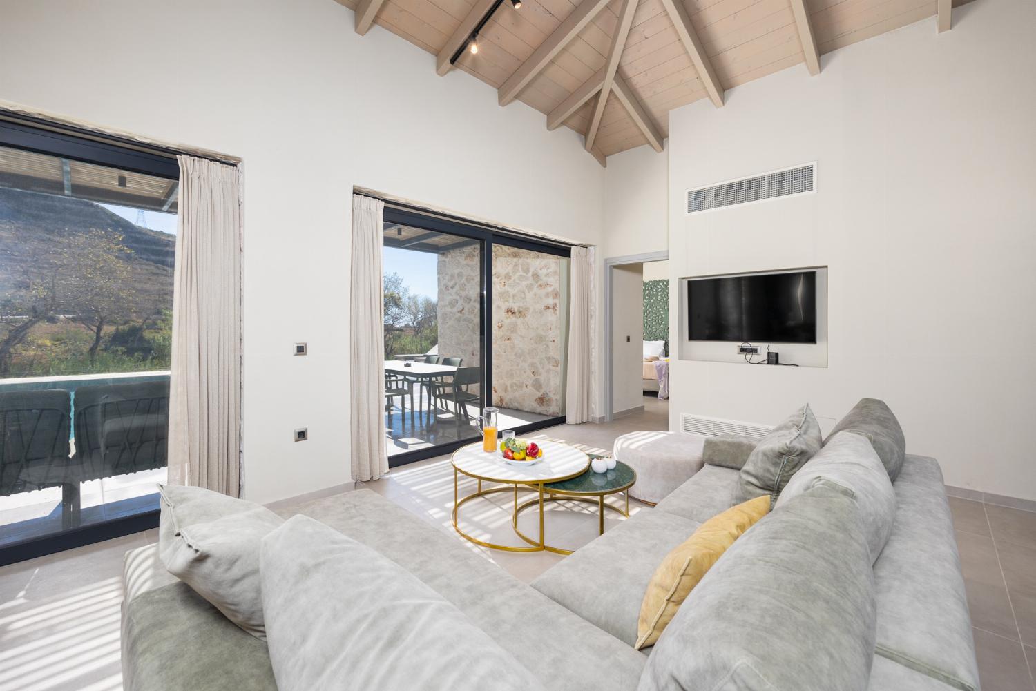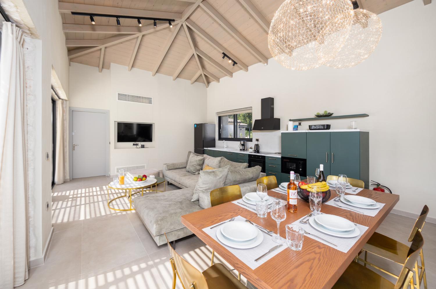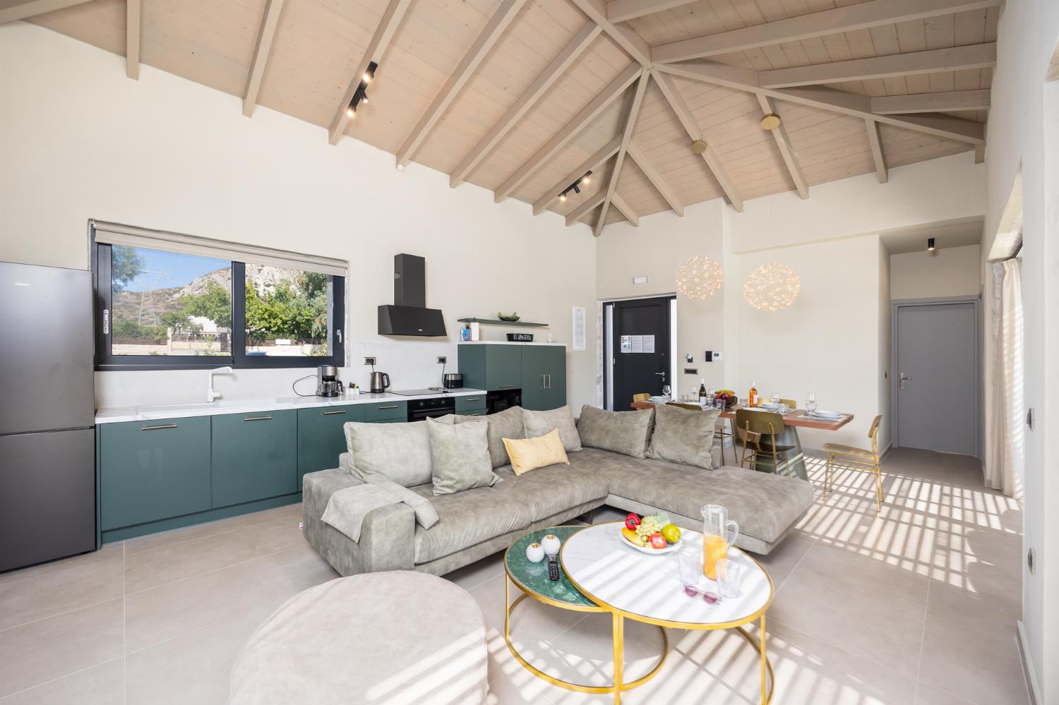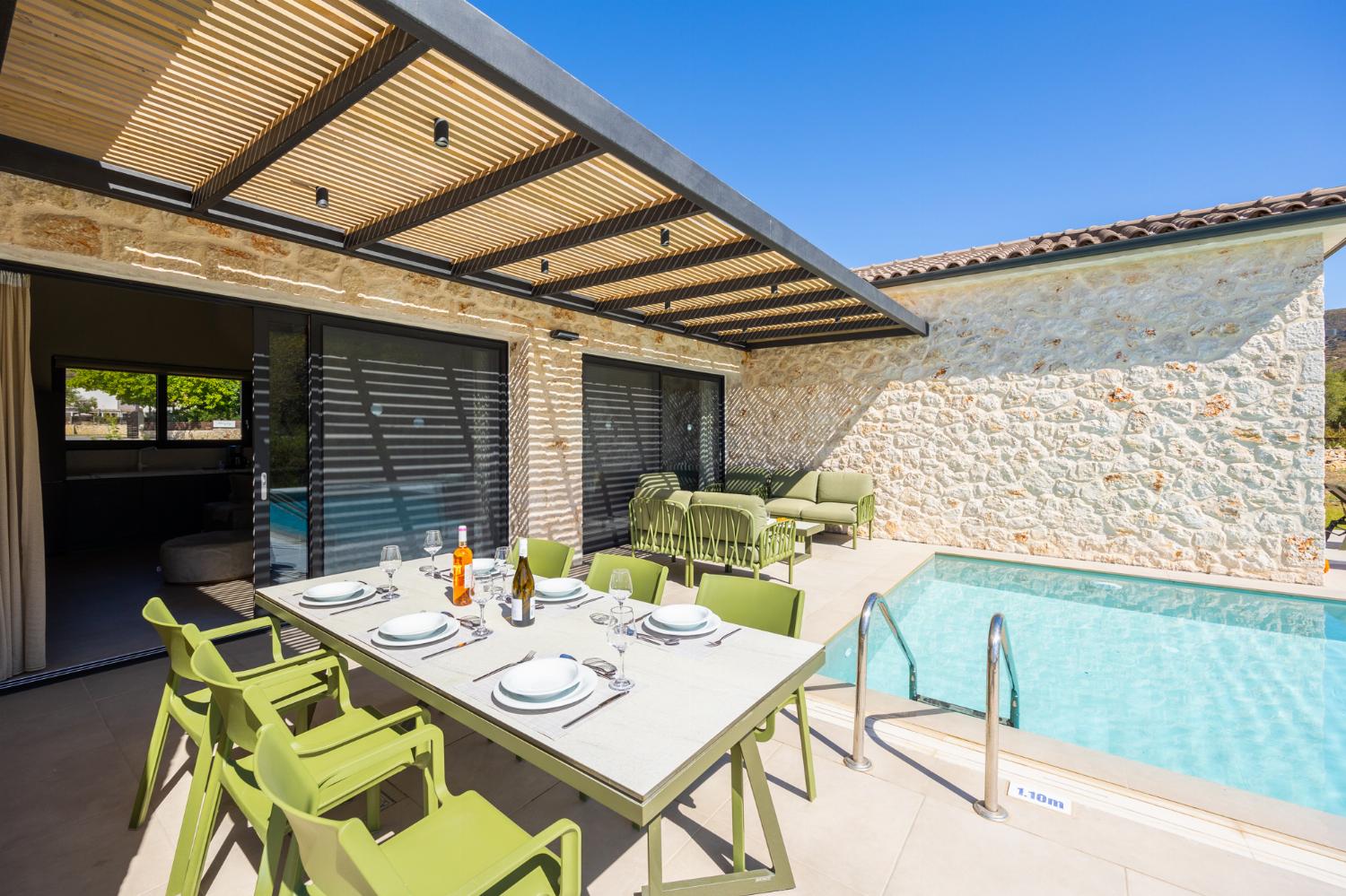 Outside, the villa offers a brick barbecue and a shaded dining area, as well as comfortable sun-beds adjacent to the private pool. The property provides secure parking and is conveniently located within an easy walking distance to the local sandy beaches, supermarket, bakery, bars, tavernas, and the harbor of Katelios, as well as a convenient bus stop.