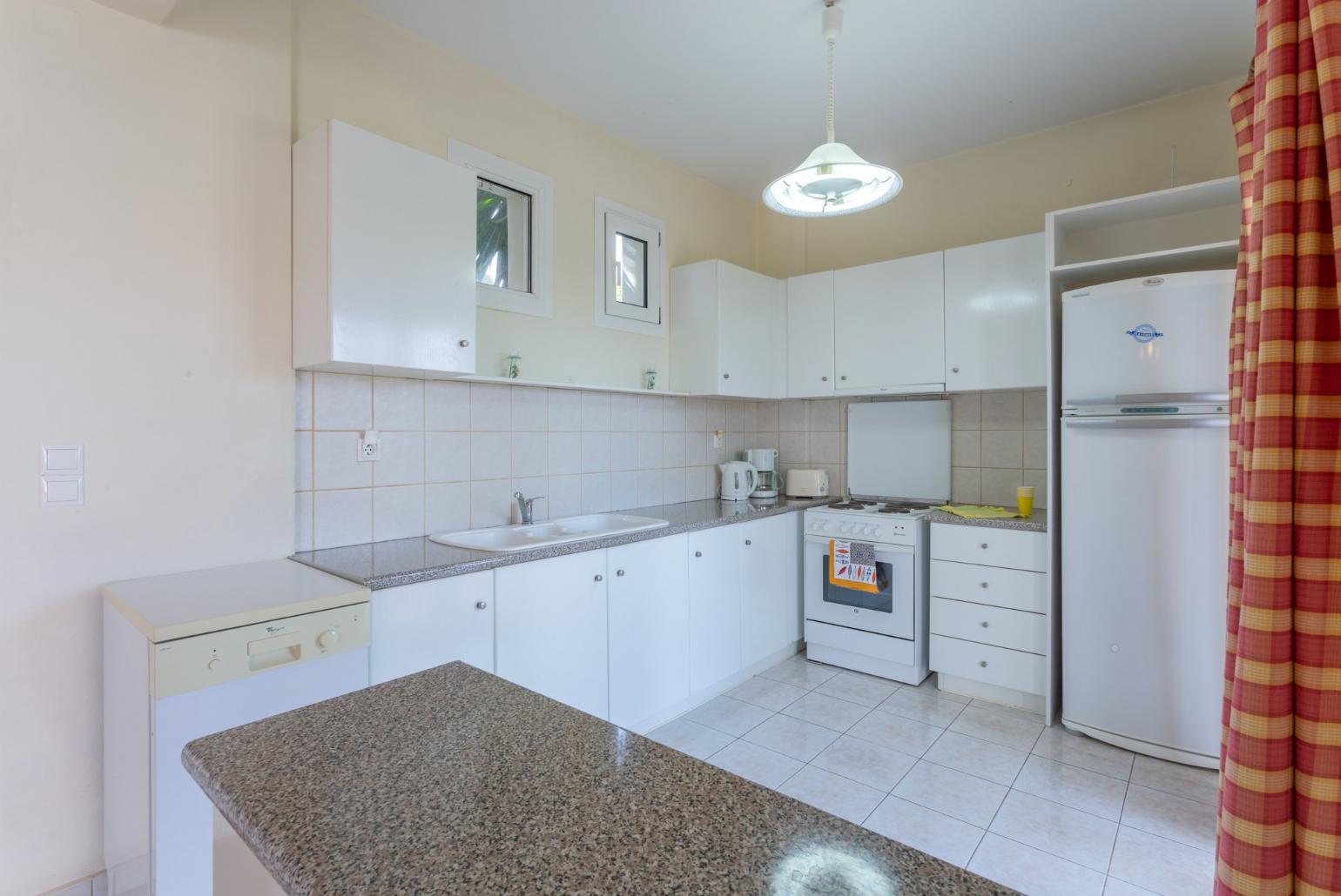 The open-plan kitchen and dining room are fully equipped with a toaster, coffee maker, washing machine, dishwasher, and microwave. A TV is also available in the dining area. For those who enjoy al fresco dining, a barbecue is provided outside.