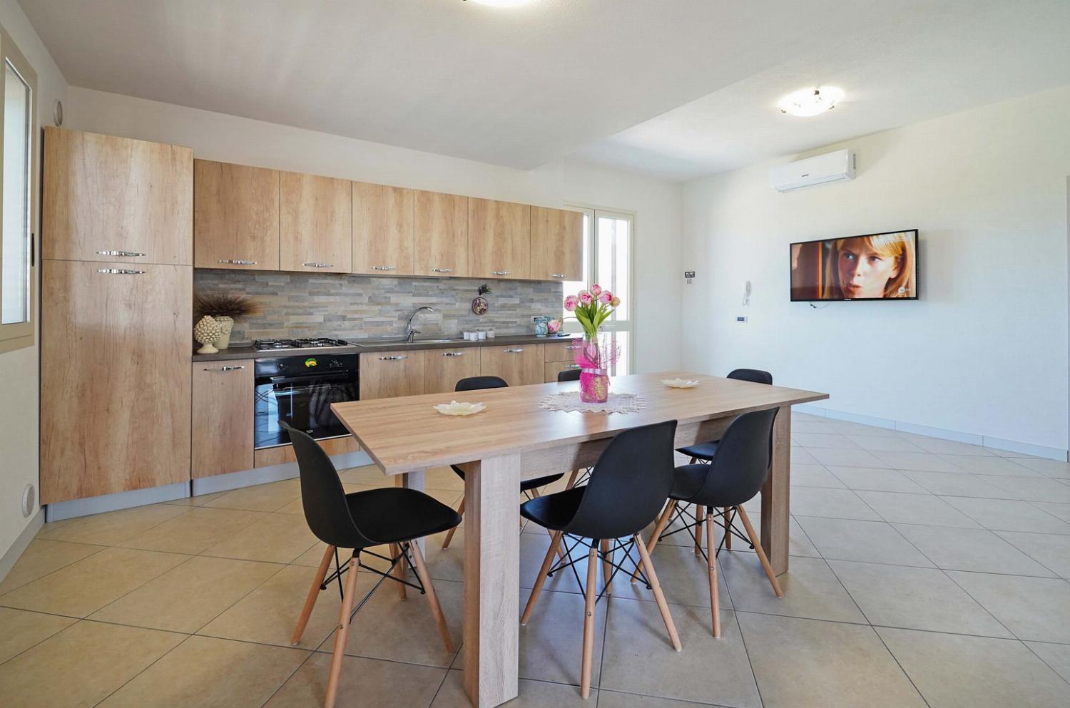 Inside, the air-conditioned open plan living room features a dining area, comfortable sofas, satellite TV, and free Wi-Fi. Patio doors lead out to the pool terrace.