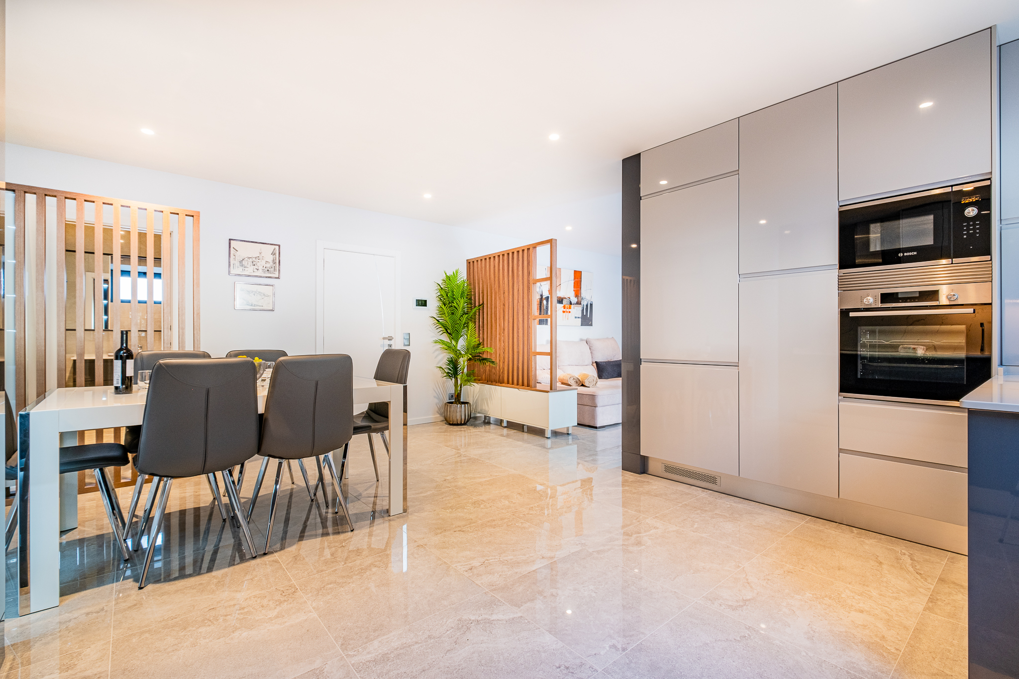 The open-plan kitchen comes with essential appliances, including a refrigerator, microwave, oven, and freezer, along with a dishwasher for easy cleanup. The kitchen is fully stocked with dishes, cutlery, and various kitchen utensils, along with a coffee machine and kettle for your convenience.