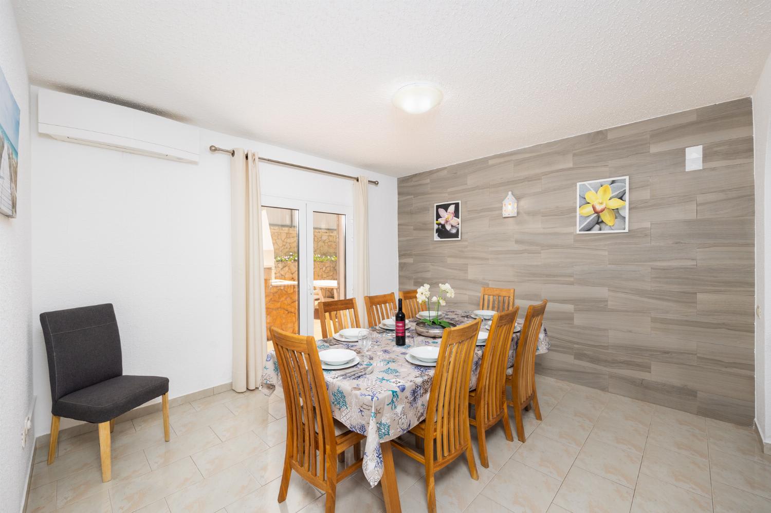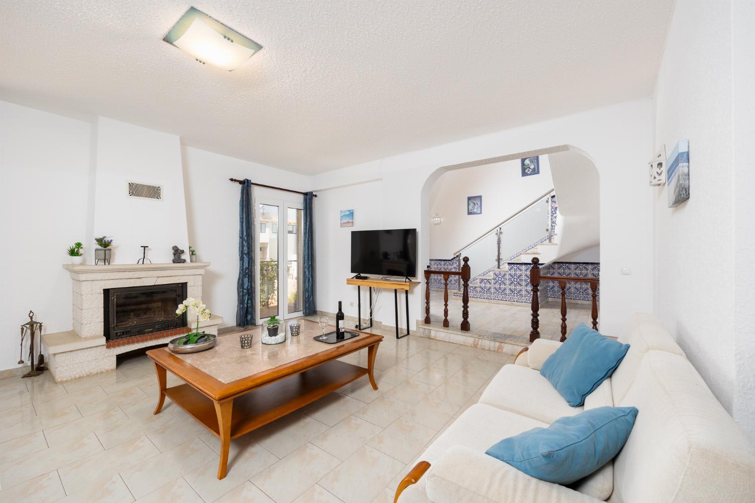 The living room is air-conditioned and has a ornamental fireplace, dining area, comfortable sofas, and satellite TV. There are patio doors to the pool terrace, where sun loungers and parasols can be found. The kitchen features a toaster, coffee maker, granite work top, washing machine, dishwasher, microwave, refrigerator, stove/hob and oven. There is also a barbecue outside.