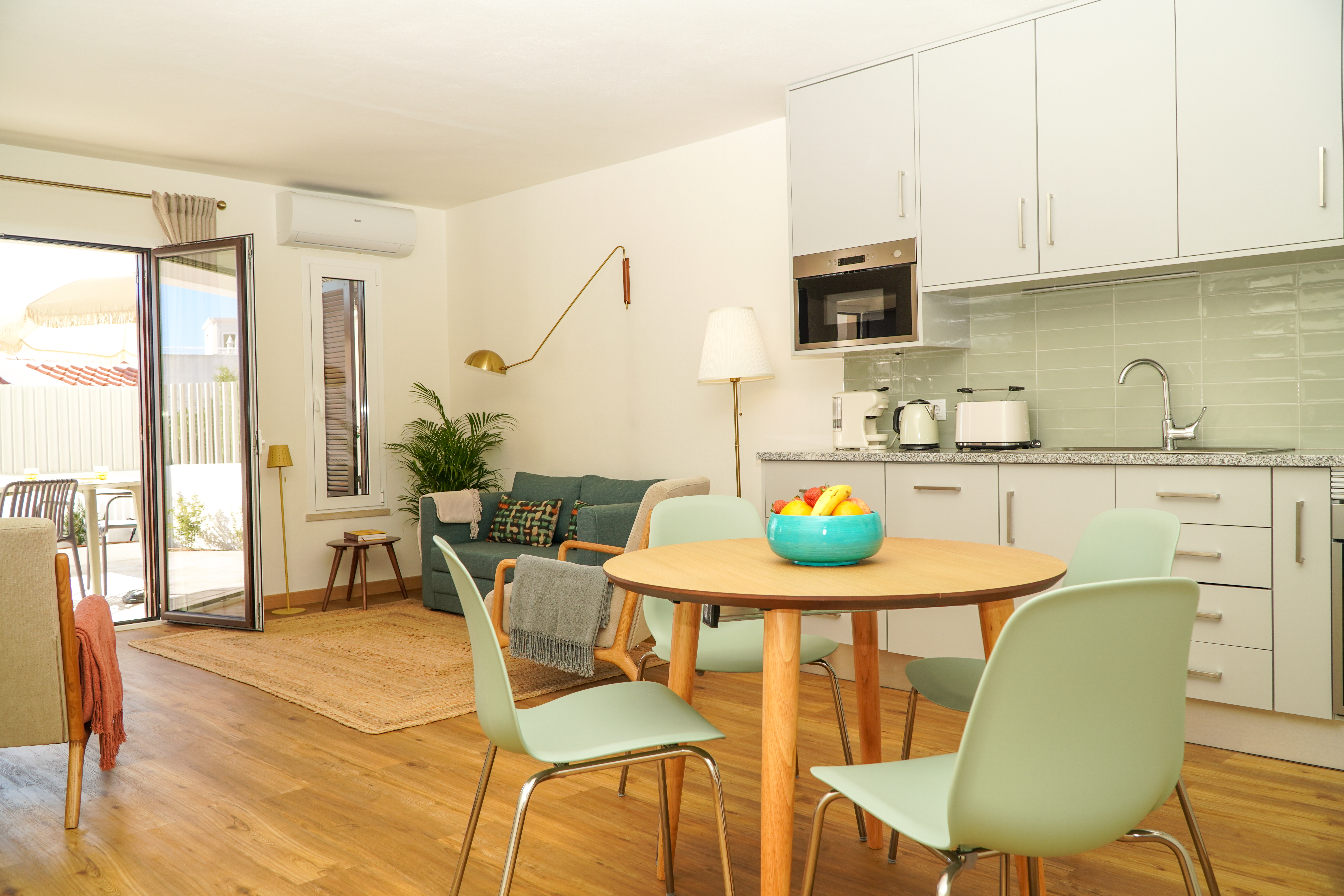 The electric open-plan kitchen is fully equipped with a refrigerator, microwave, oven, freezer, and dishwasher, alongside all necessary dishes and utensils. To further enrich the culinary experience, guests will find a coffee machine, toaster, and kettle readily available for their convenience.