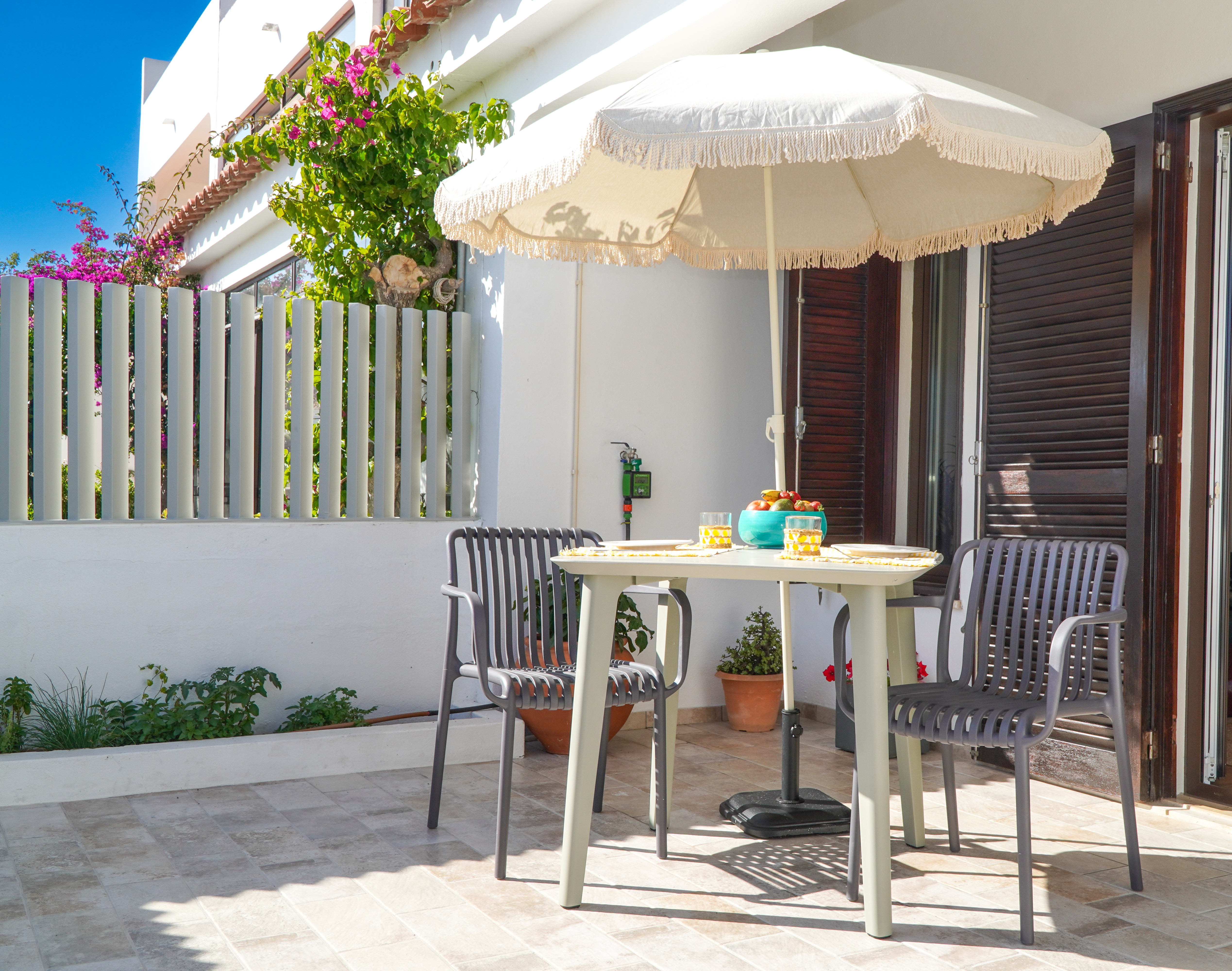 The stanchion apartment is tastefully designed for up to three guests, featuring a bedroom and a sofa bed in the living room. Patio doors lead to a tranquil garden with seating for relaxation. Guests also benefit from access to a communal swimming pool, situated only a minute’s walk away, along with available open-air parking in proximity.