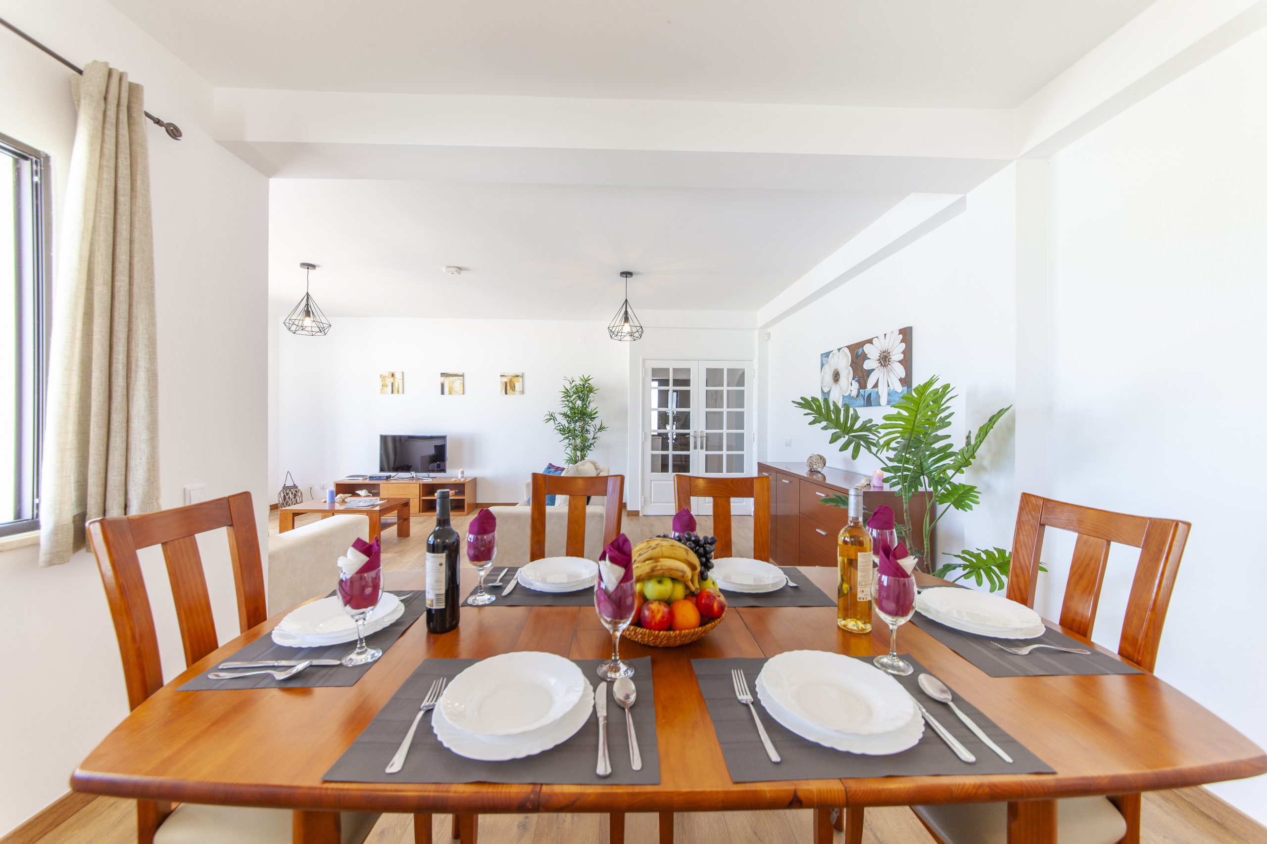 The kitchen is fully equipped with the necessities such as: fridge, freezer, oven, kettle, and toaster. The living room/dining area is furnished with comfortable sofas, a TV, and a wooden dining table that seats 6 guests. There are also sliding doors that allow access to the terrace area, which is furnished with an outdoor table that seats 6 guests - perfect for al fresco dining. As well as a spacious outdoor barbecue and bar area.
