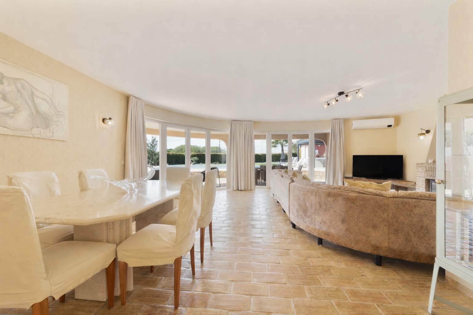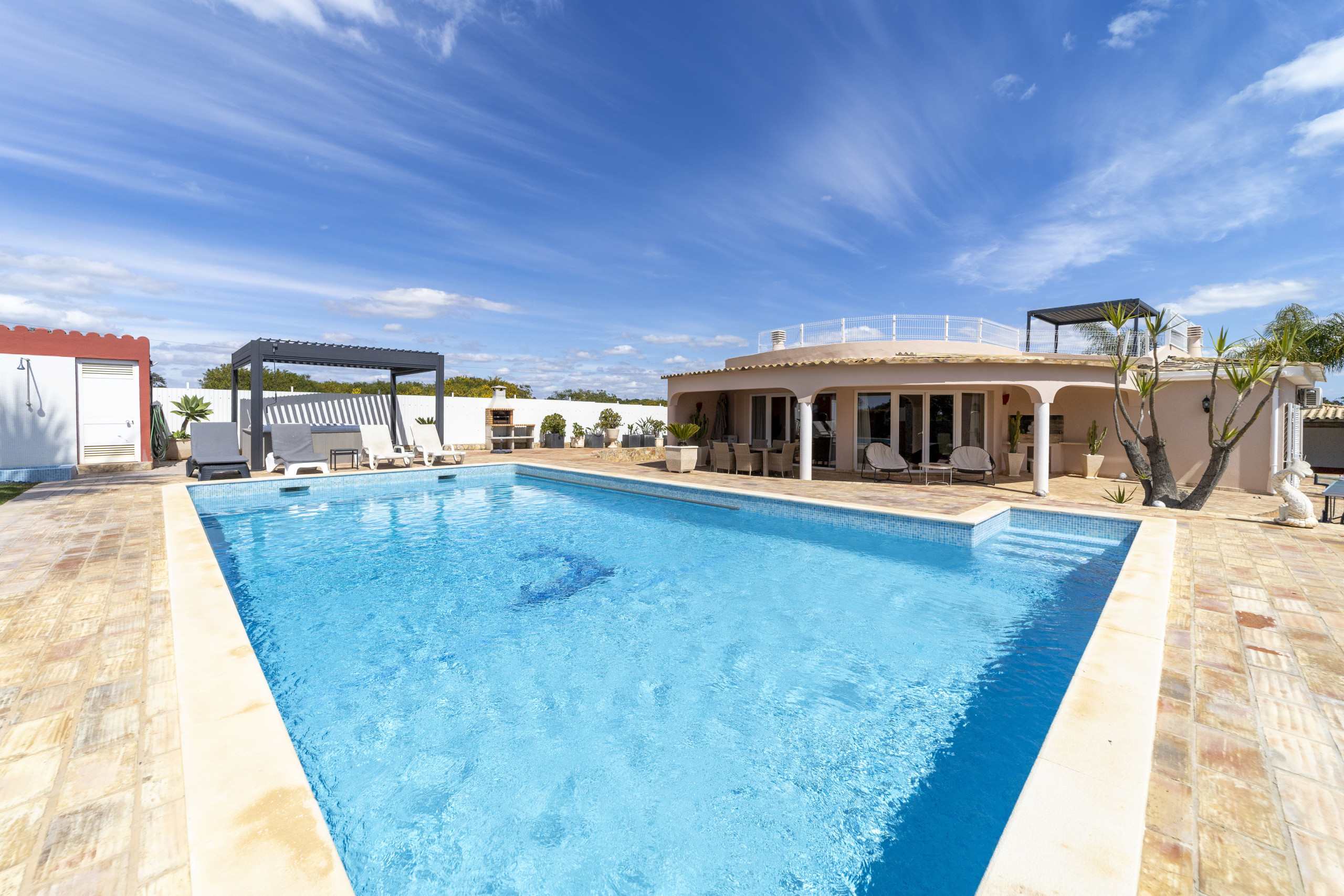 Appealing to families or groups seeking a relaxing location but within a few minutes of the coast, the villa is ideally located near to Olhos de Agua and just a short drive from the buzz of Albufeira. Internally there is a spacious fully fitted white kitchen topped with a glossy black marble work surface. Integrated appliances from Bosch include electric oven, induction hob and a dish washer. The washing machine, dryer, iron and ironing board are situated in the separate laundry room, which also has plenty of storage space. Other appliances include fridge freezer, microwave, Dolce Gusto coffee machine, electric kettle, toaster, and hand blender.