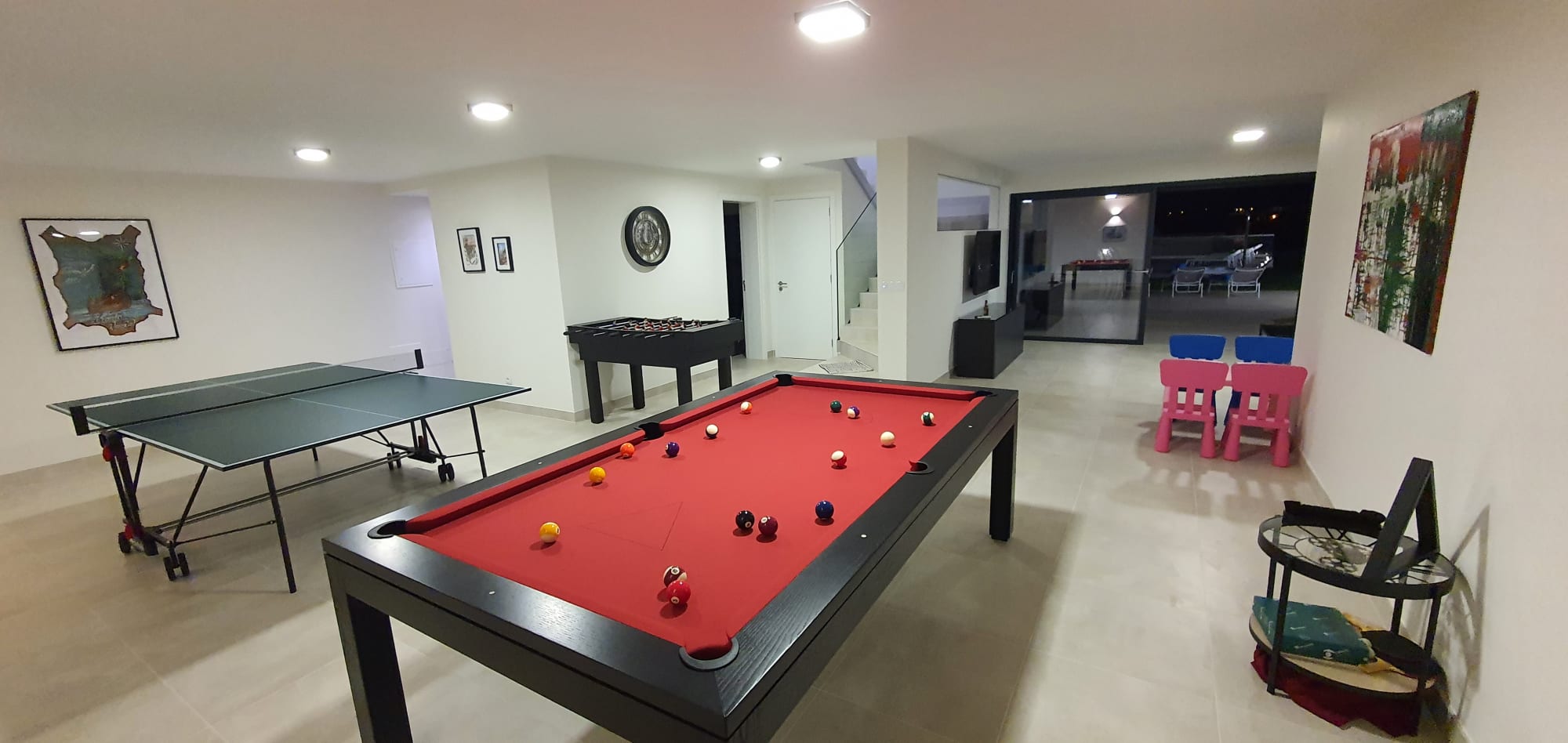 Upon entering the gate, the huge green lush lawned grounds welcome you. 600 metres square and more! There is a beautiful infinity pool, that can be heated if required, and a jacuzzi hottub that can seat 6 people. A children’s swing and slide set is a great addition for families. There is a built BBQ near the pool area, and the games room opens out onto here. There is a pool table in here, football table and also table-tennis table! With a bluetooth speaker and you have such a wonderful rage of entertainment in Villa Olhos Sun.