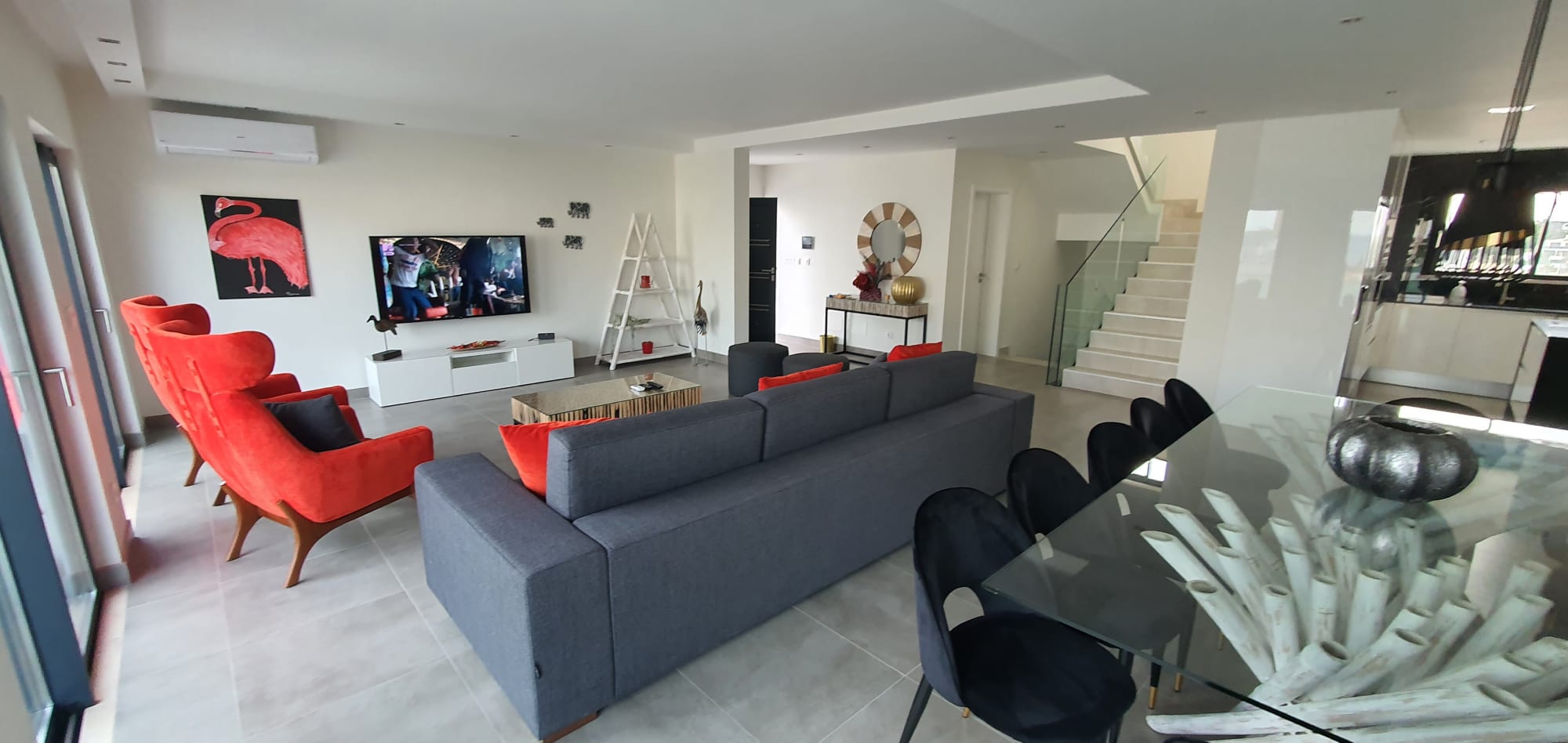 There are 5 large en-suite bedrooms, each with LED TV and local and international channels. They have great balconies facing south with fantastic countryside and stunning sea views.