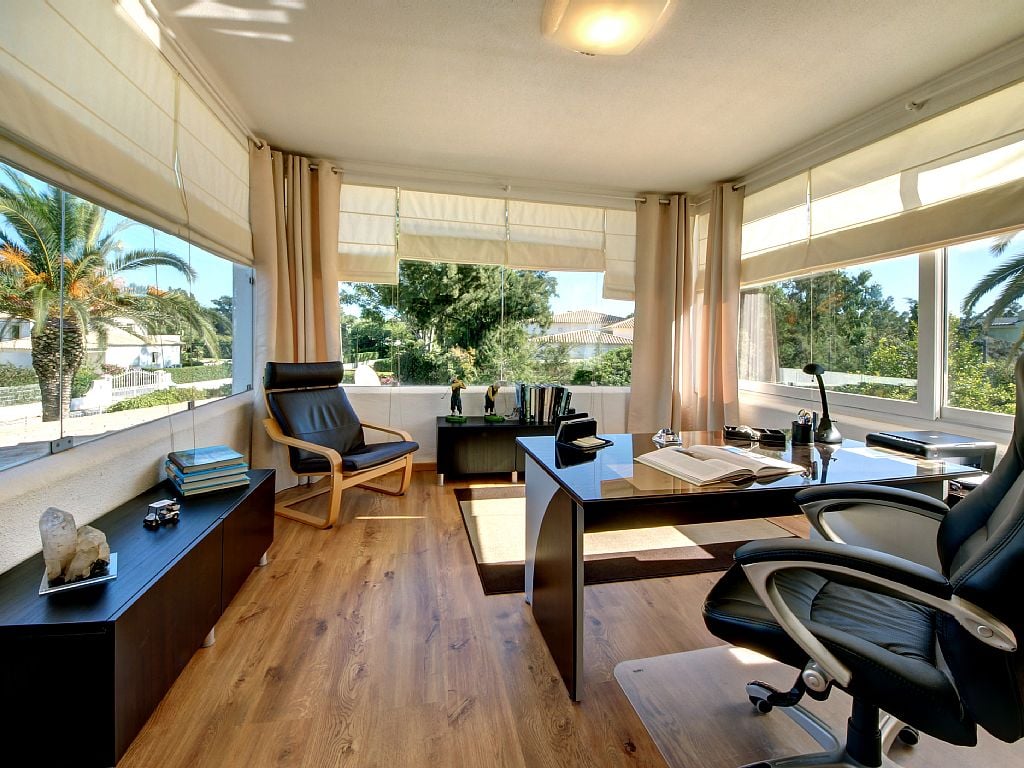 There is also a study/office, which is a bright and sunny room with windows on three sides. This allows for views of the pool on one side and the surrounding villas and gardens on the other.
