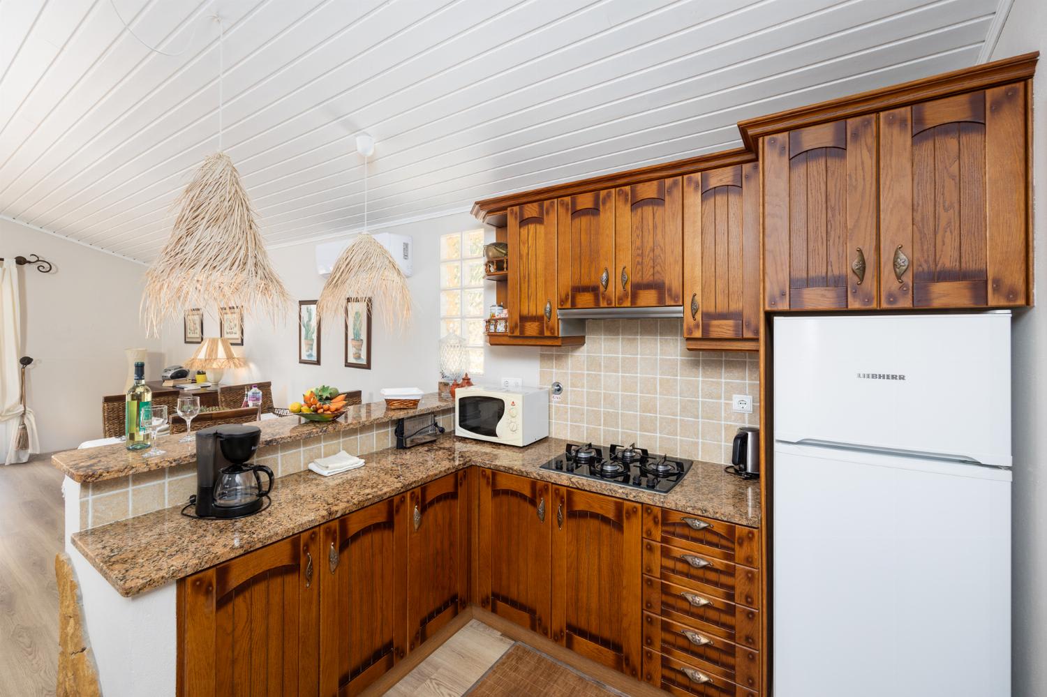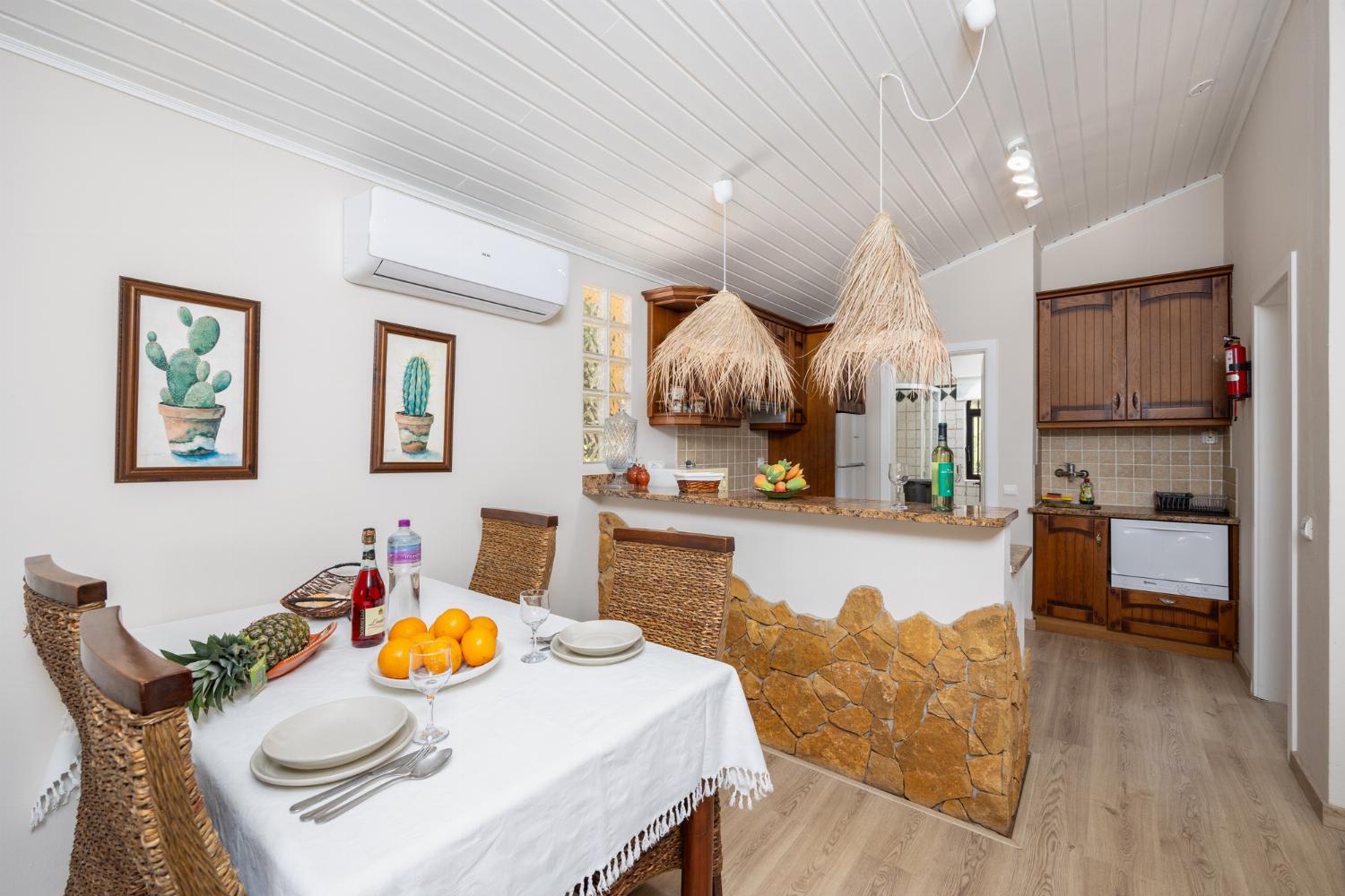 Inside, the living room is air-conditioned and has an adjoining dining area (with wooden table that seats four guests), comfortable sofas, and satellite TV. The kitchen features a toaster, coffee maker, granite work top, washing machine, dishwasher, microwave, refrigerator and stove/hob.