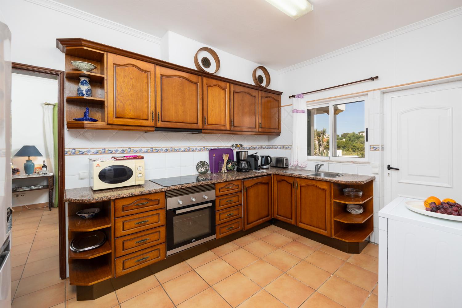 The living room is air-conditioned and has an ornamental fireplace, dining area, comfortable sofas, satellite TV and free Wi-Fi. There are patio doors that lead to the pool terrace. The kitchen features a toaster, coffee maker, granite work top, washing machine, dishwasher, microwave, refrigerator, stove/hob and oven.