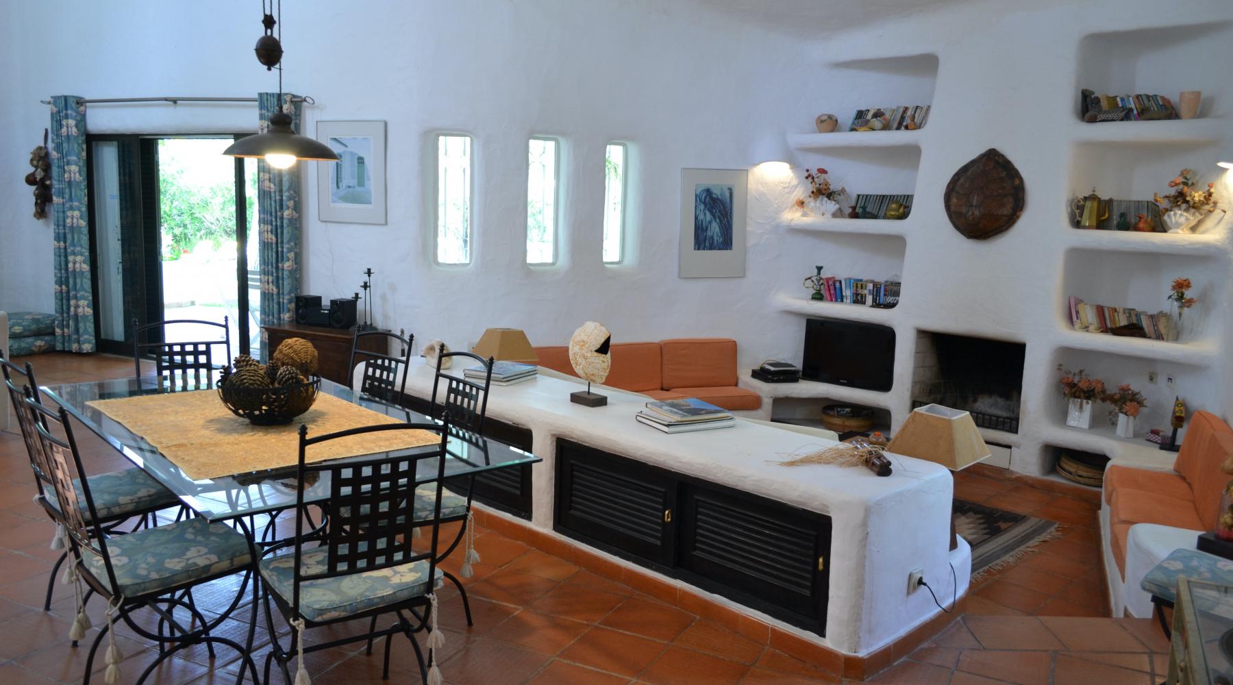 Inside, the villa is bright and airy, simple, and traditional in design. The very spacious lounge and dining area has an open fireplace, a built-in corner sofa, and shelves with additional large, comfortable sofas and chairs. On the ground floor, there are two twin bedrooms, one bathroom, and one double bedroom with an ensuite. The upper floor also has a double bedroom with an ensuite. The villa comes with wifi, cable TV, and air conditioning in all the bedrooms.
