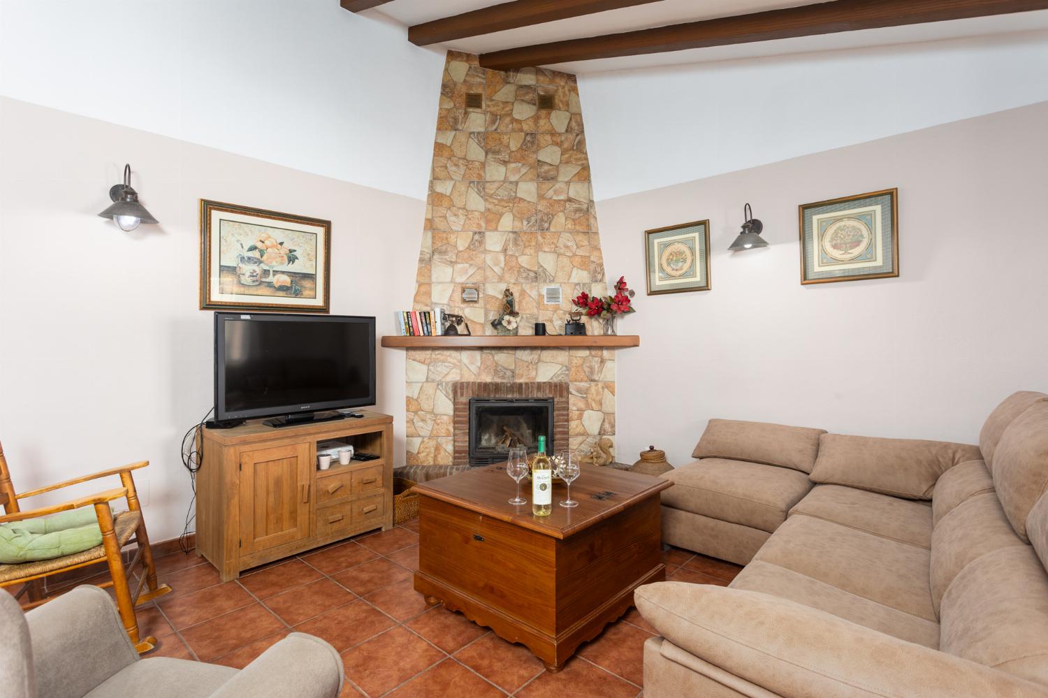 The living area features a cozy fireplace, a comfortable sofa, a satellite TV, and complimentary Wi-Fi. Adjacent to this space is a dining area with a wooden table that accommodates four guests, while the fully equipped kitchen includes essential appliances like a microwave, oven, coffee machine, and dishwasher. A door in the kitchen leads out to a terrace.