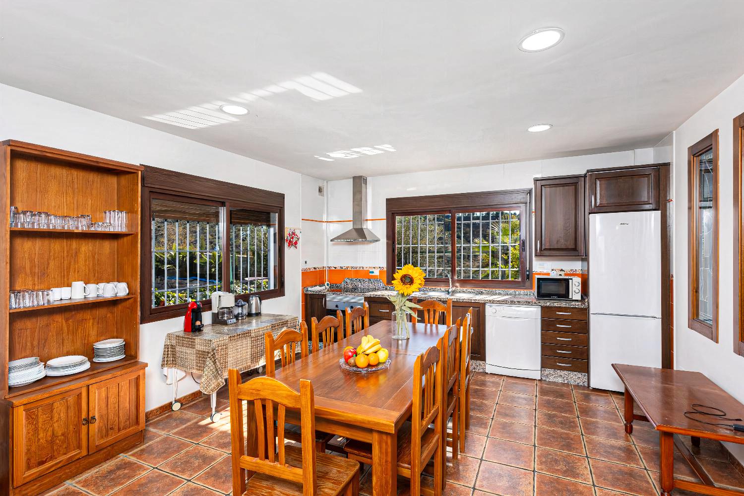 Inside, you will find a bright and spacious living area furnished with comfortable sofas, a TV, a DVD player, and a coffee table. The adjoining kitchen and dining room are fully equipped with essential appliances, including a fridge, freezer, microwave, oven, and dishwasher, making for a cosy and enjoyable stay.