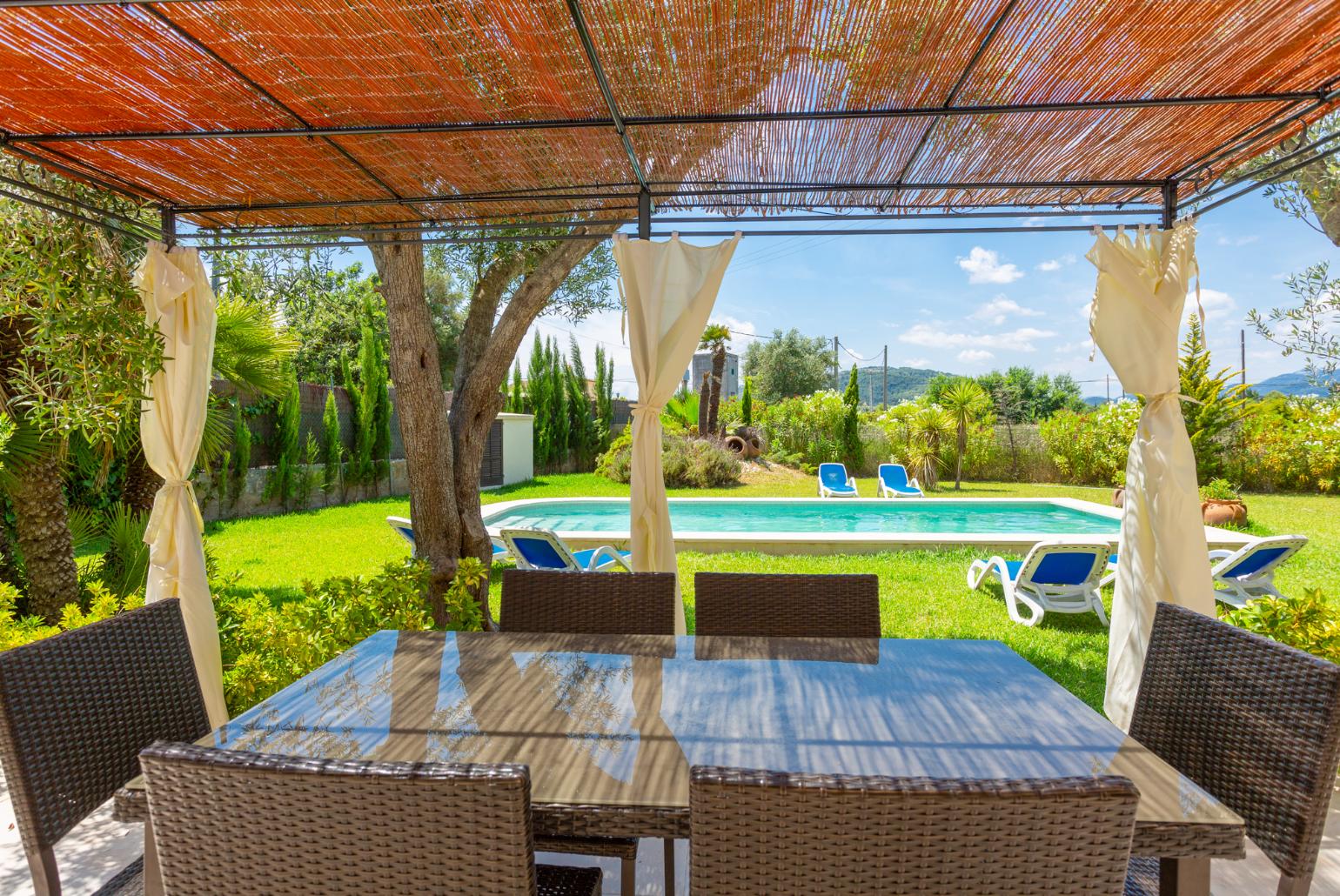 The private swimming pool is a serene retreat, measuring 9.0 meters by 4.0 meters. It features a shallow end with a depth of 0.90 meters and a deep end reaching 1.90 meters. The pool boasts a south-facing aspect, allowing plenty of sunlight throughout the day, and can be accessed easily via steps. Additional features include a pergola, sunbeds, and a poolside dining area, creating the perfect setting for relaxation and leisure.