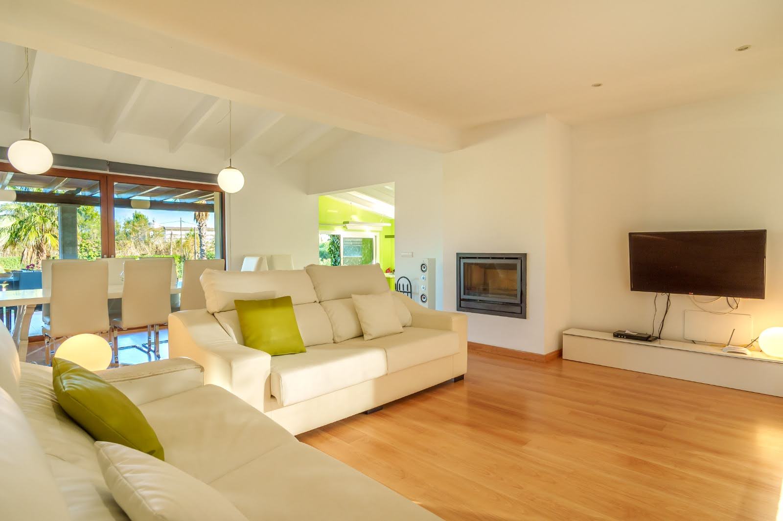 Inside, there is a bright and spacious living room/dining room, which are furnished with two comfortable sofas, a TV, and a dining table that seats 8 people. Tall sliding doors are also available, which leads out to the lovely covered terrace area. The open plan kitchen is fully equipped with the necessities such as: refrigerator, microwave, oven, freezer, dishwasher, and toaster. The bedroom has a queen size bed.