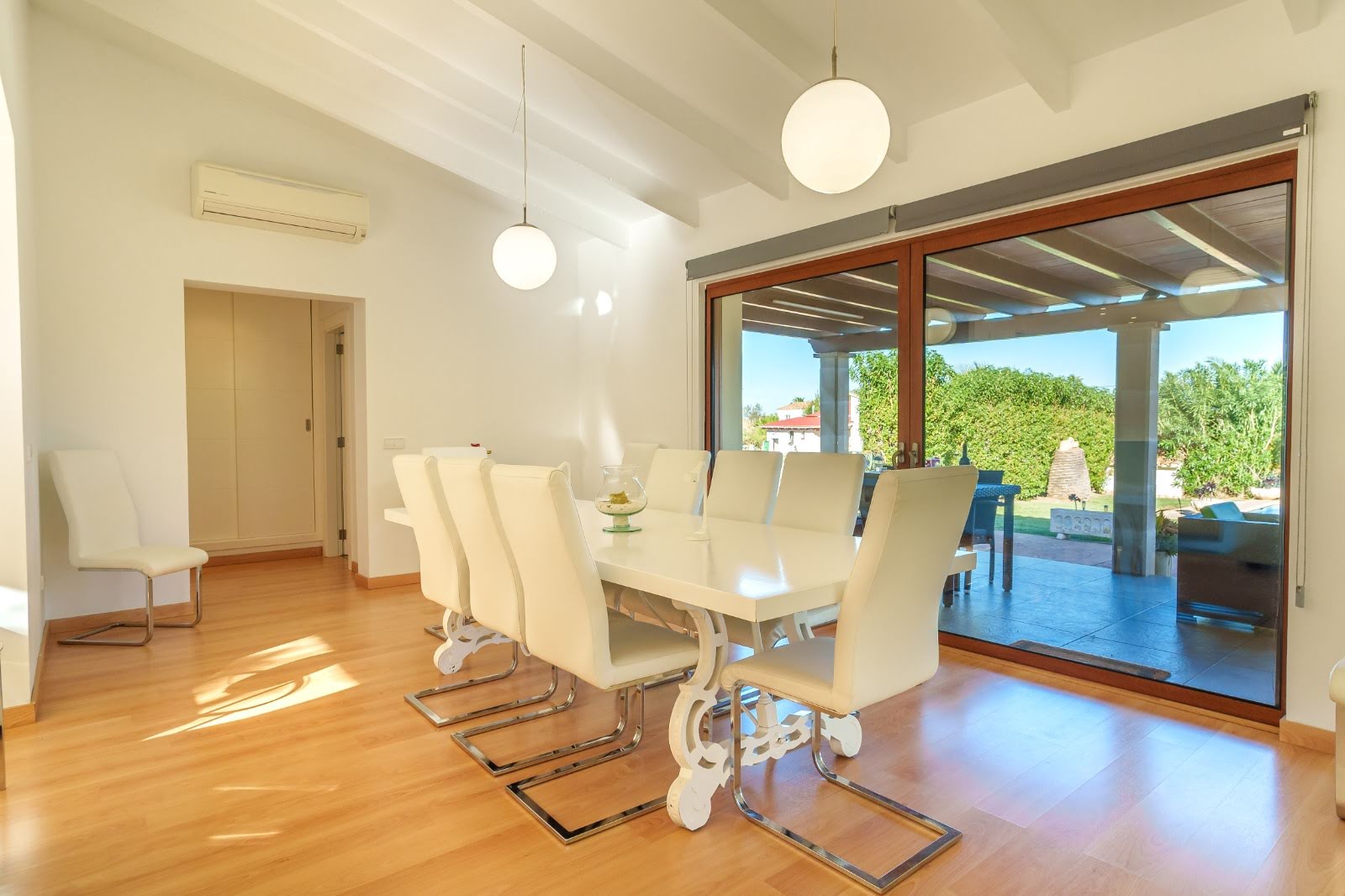 The covered terrace is furnished with an outdoor dining table that seats four guests as well as some outdoor lounge chairs - perfect for those who want to spend time relaxing outside. The pool is surrounded with sun beds and parasols - a barbecue and convenient outdoor shower is also accessible in the garden.
