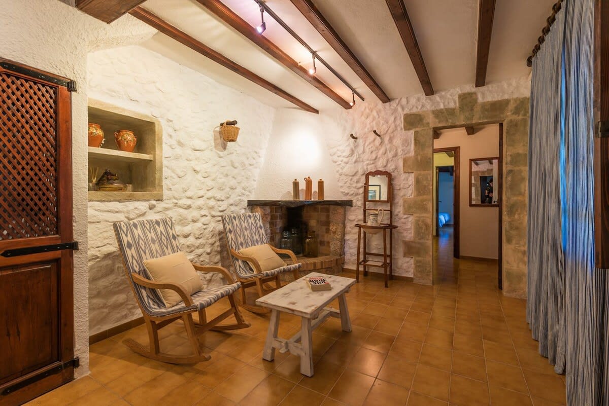 As you enter the Finca there is a utility room, equipped with a washing machine, iron and ironing board, and an extra refrigerator. There is also an open plan, fully equipped, kitchen. The lounge offers two comfortable sofas, fireplace, and a TV. On the same floor, there is a double room and a twin bedroom and in-between there is a renovated bathroom with a walk in shower.