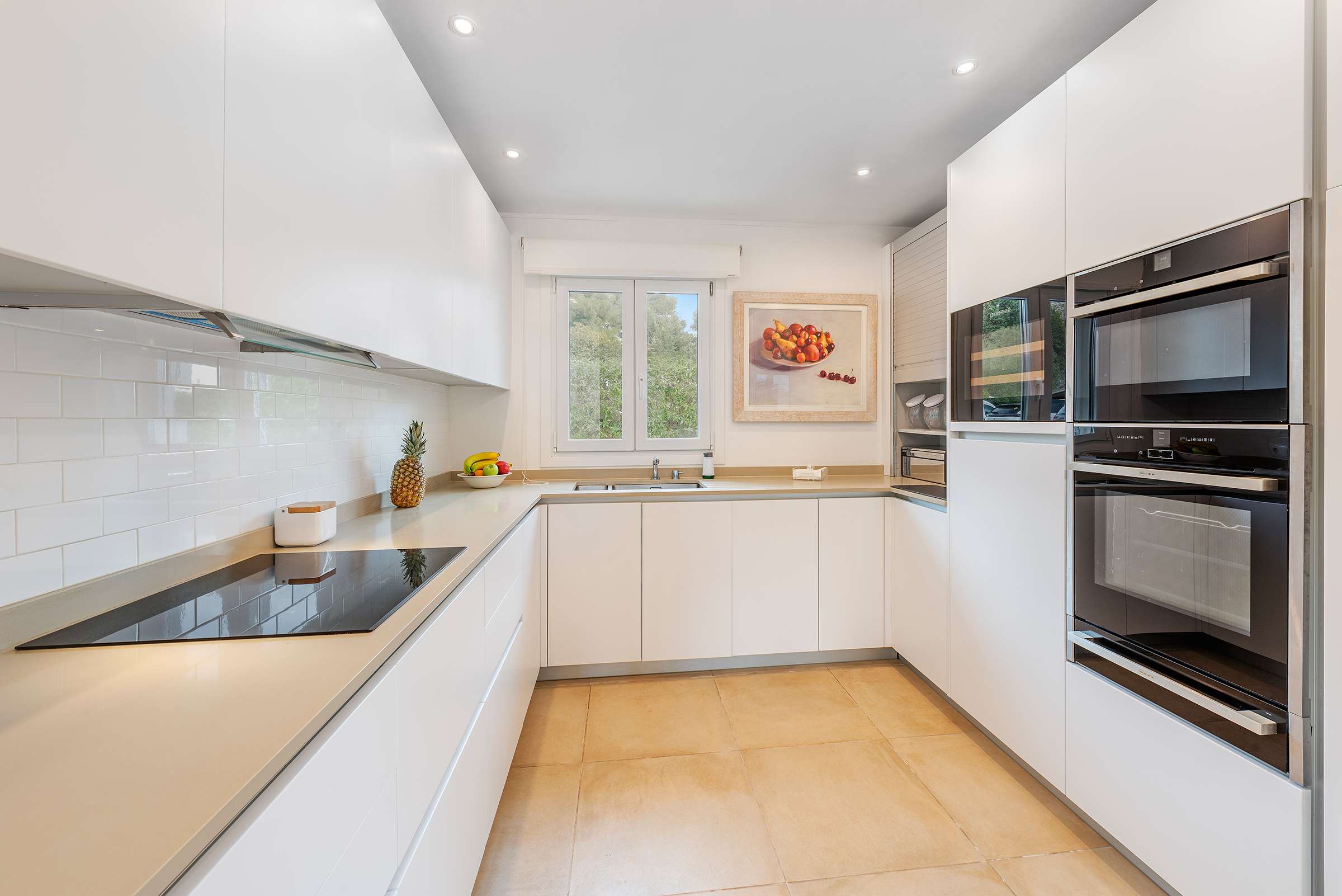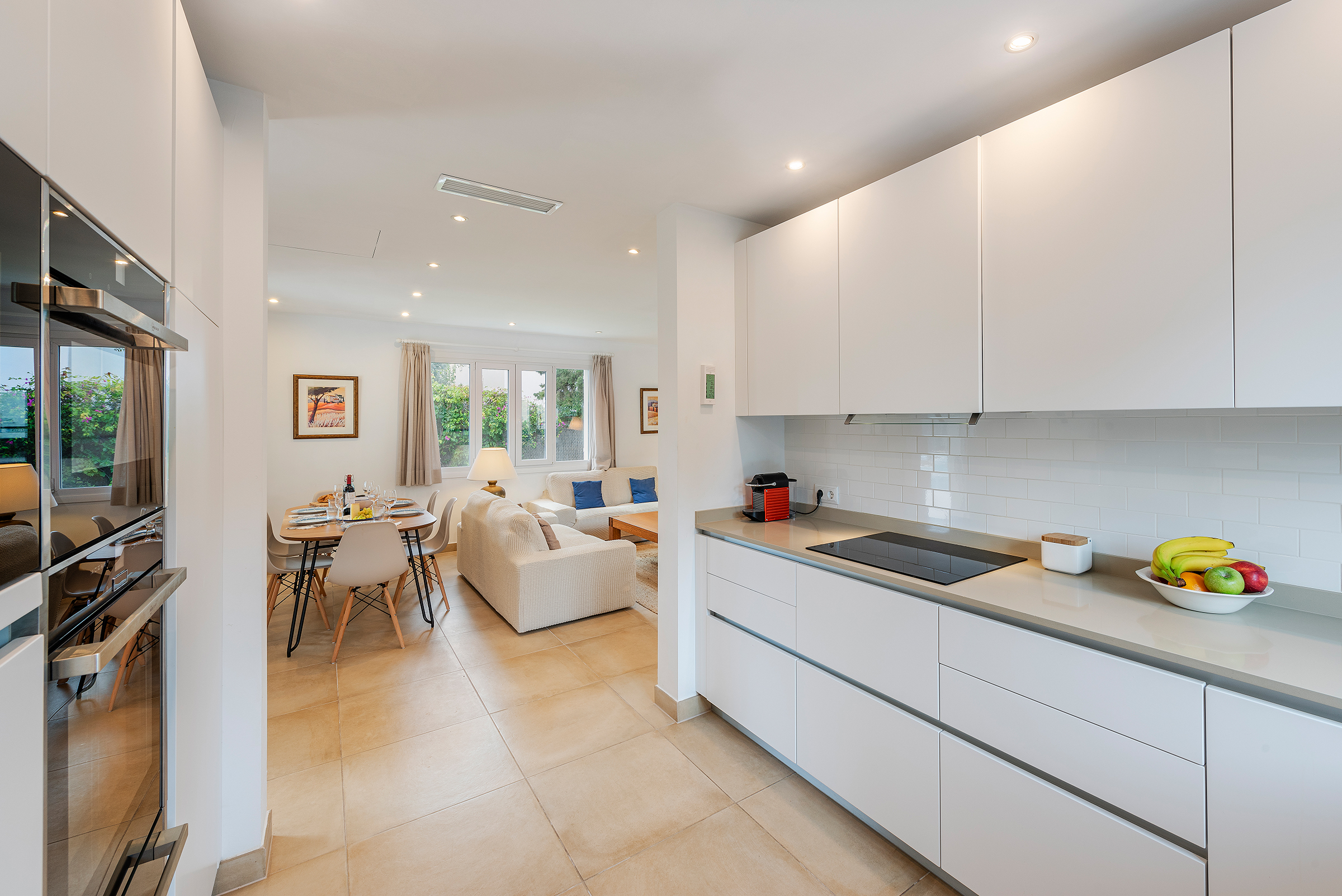 The heart of the villa is its spacious open-plan living area, where natural light pours in through large windows, creating a bright and airy atmosphere. The modern, fully equipped kitchen is ideal for self-catering during your holiday. You can enjoy your meals at the elegant dining area or step outside to the outdoor terrace for al fresco dining under the stars.