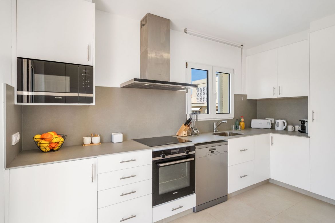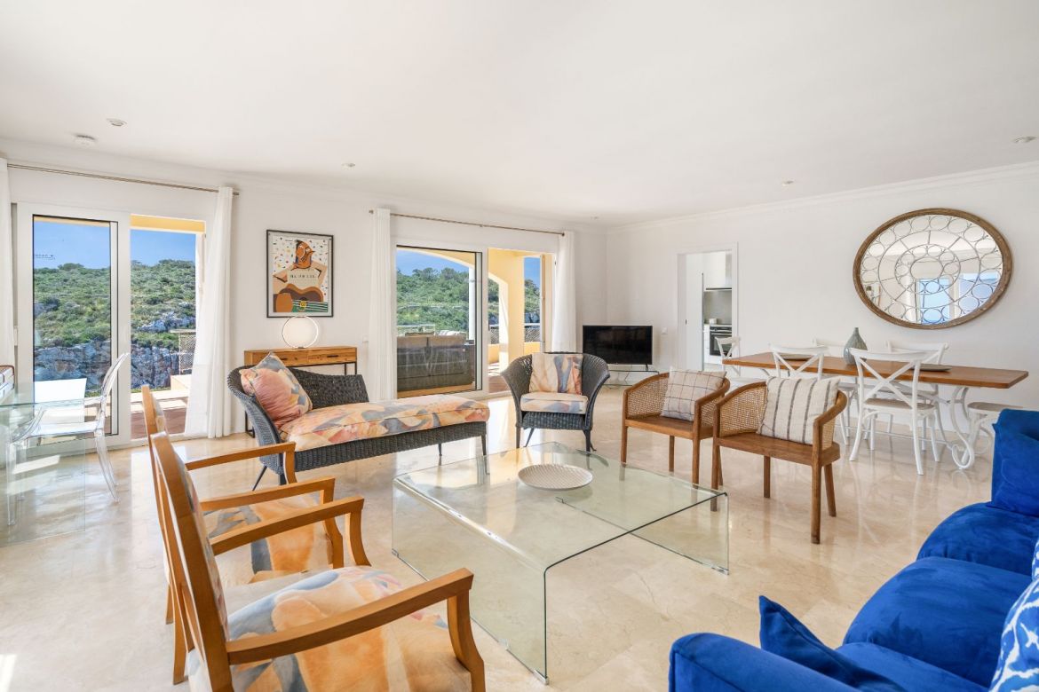 Inside, there is a fully- equipped kitchen including a large fridge-freezer, microwave, oven and a toaster. The bright and spacious lounge/dining room is furnished with a comfortable sofa, six chairs and a wooden dining table that seats six people. There are also large patio doors leading out to the covered terrace area that is furnished with outdoor sofas and has beautiful sea views.