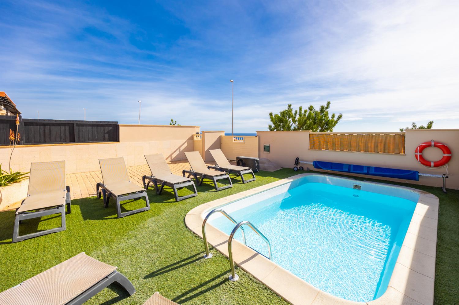 Villa Butterfly Bay is located in Caleta de Fuste, Fuerteventura. This semi-detached vacation rental property offers air-conditioning and free Wi-Fi and sleeps up to 12 people (10 Adults and 2 Children) with 5 Bedrooms and 3 Bathrooms. There is a private pool (South Facing) with barbecue and Sea views. Walking distance to the Restaurants.