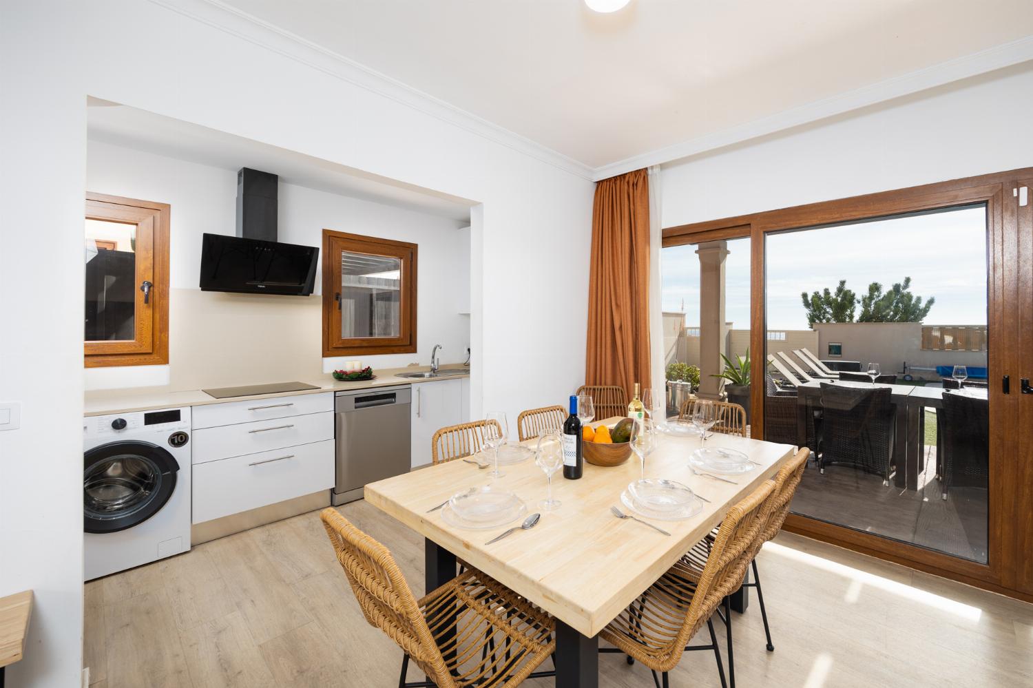 The inviting living room is designed to promote relaxation and togetherness, featuring air conditioning to keep you cool during warm days. It includes a comfortable dining area and plush sofas, perfect for lounging or enjoying a movie on the flat-screen TV. Complimentary Wi-Fi ensures that you can stay connected, while large glass doors open directly onto the pool terrace, where breathtaking sea views can be appreciated.