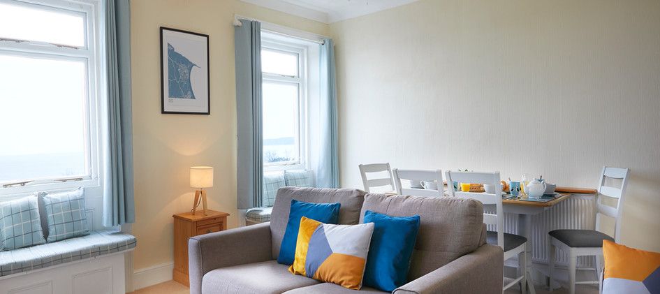 The living space is designed for relaxation and enjoyment, featuring a dining table with four chairs, two cosy sofas, and a TV for entertainment. The window seats offer fantastic views of the sea and Crescent Gardens, creating a serene atmosphere. Throughout the property, gas central heating ensures a warm and inviting environment.