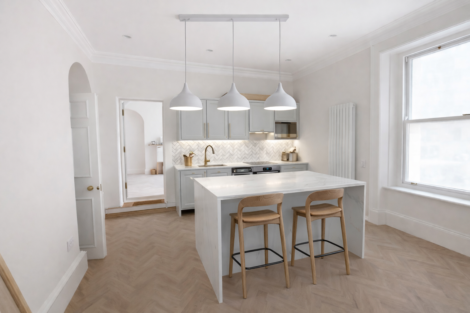 The Bridge House has two huge sash windows, with unrivalled views looking right up the river. Spacious and light living and dining area and separate kitchen. The second floor has a little shower room and toilet, and two bedrooms - a small but cosy double room, and a large bright and twin bedroom, both with original fireplaces. (Optional trundle bed available on request.) The third floor has a large King sized bedroom, flooded with natural light, with original 1800’s fireplace and curtain ring, with classic panelling and LED lights.