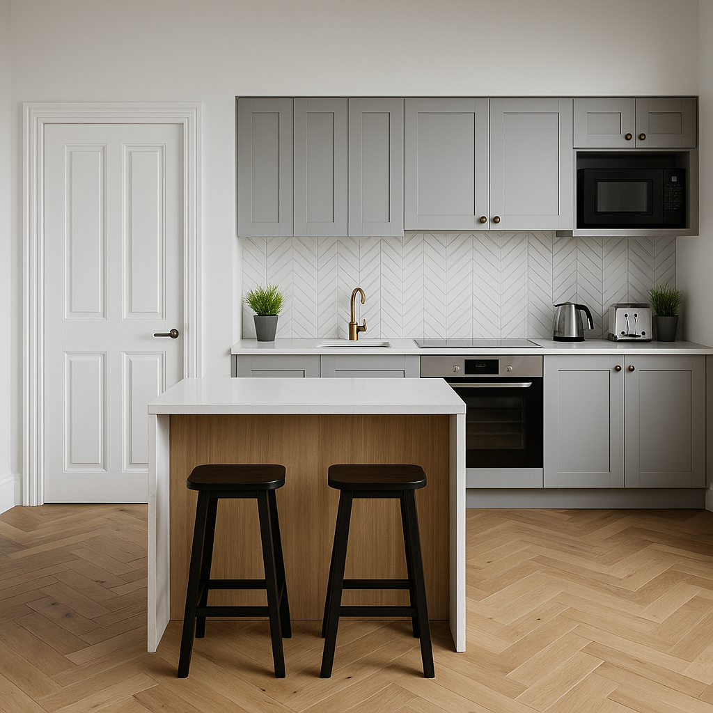 Apartment Two has a rich, earthy atmosphere, deeper tones and ambient lighting, there is a warmth and ancient character here, giving real charm and luxury. Enter into the hallway of the apartment and there is space for shoes & coats. To your left, the cosy living room has a large comfortable corner sofa and stunning views of the river from the large window. The beautiful kitchen, set with porcelain worktops and copper and a deeper coal colour, has all the modern comforts you will need. The bedroom to the right has amazing river views to be enjoyed from your pillow. Apartment Two is a cosy, mood-lit escape with darker tones and plush textures — perfect for guests who love a more intimate, atmospheric vibe.